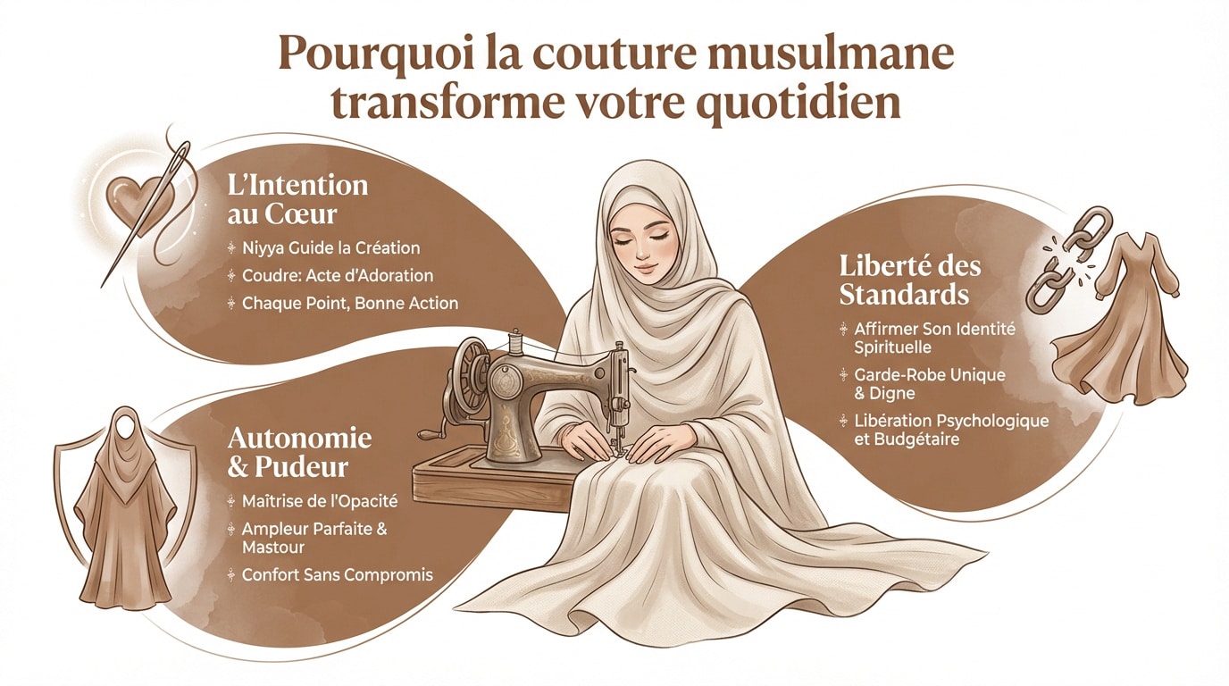 Se mettre à la couture est bien plus qu'un simple loisir créatif ; c'est un véritable acte d'adoration (Niyya) qui vous permet de reprendre le contrôle total sur votre pudeur. En confectionnant vos propres pièces, vous garantissez le respect absolu des critères du vêtement mastour, avec des coupes amples et une opacité parfaite, tout en vous libérant des diktats de la mode conventionnelle. ✨